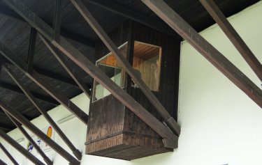 die hölzerne Sprecherkabine, die von der Rückseite aus zugängig wie eine Kanzel oberhalb der